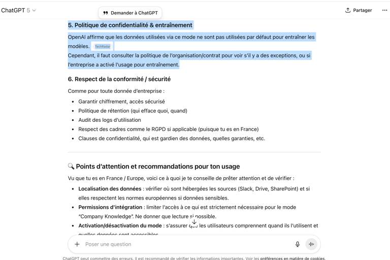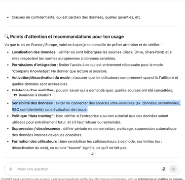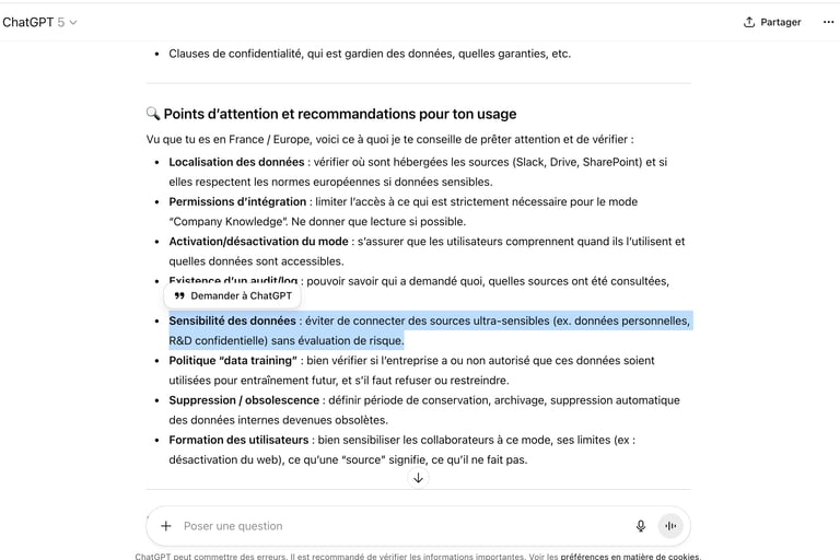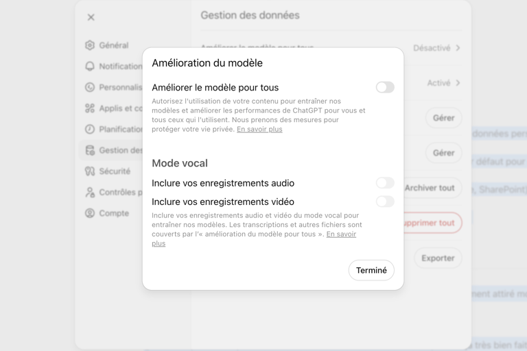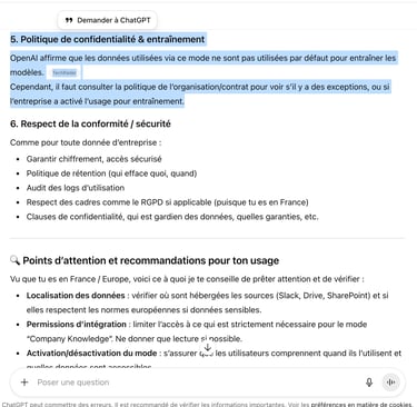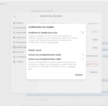 👉 N’oubliez pas de désactiver l’option “Utiliser mes données pour entraîner le modèle” dans les paramètres. (Détail dans la dernière slide.)