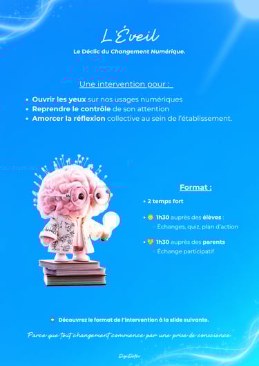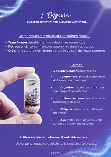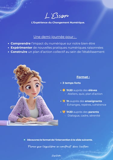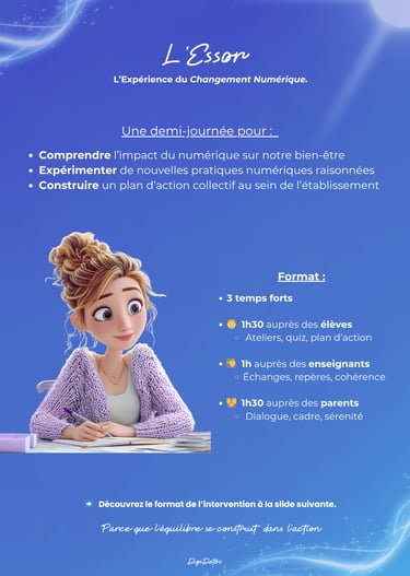 Aider élèves, parents et enseignants à retrouver un usage raisonné et apaisé du numérique, grâce à des interventions concrètes et bienveillantes.